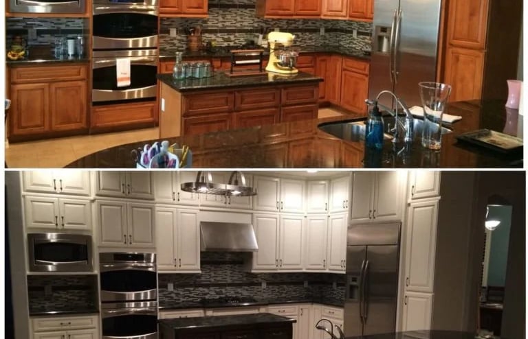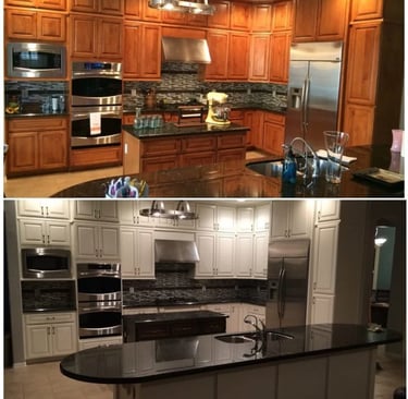 We recently moved into a new home and the cabinets needed some help. We’re not ready to replace them, so we decided to have them refinished. We got an estimate from the first company and it was way out of our budget. I found Goldtree Cabinets online and gave them a call. They gave me an estimate over the phone for the cabinets in the entire house and the price was great! I worked with Kristi who answered all my annoying questions via text and was such a pleasure to work with. She gave an option to update the hinges with hidden soft close, and replace all hardware of our choice. It was a 3-day process. Wed they came to pick up the doors and drawers. Fri they came back to paint the rest of the cabinets and install the doors and drawers The crew was so friendly and fun to be around. When they were finished, they yelled, “COME LOOK AT YOUR NEW KITCHEN!” It was so exciting. Our cabinets look awesome. I’m so glad we chose Goldtree Cabinets and will recommend them to everyone.